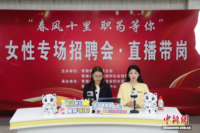 3月11日,“春风十里职为等你”女性专场招聘会在青海省会西宁举办。现场提供会计、文员、家政等岗位800余个,吸引求职者前来应聘。图为现场设立的直播带岗。中新社记者马铭言 摄