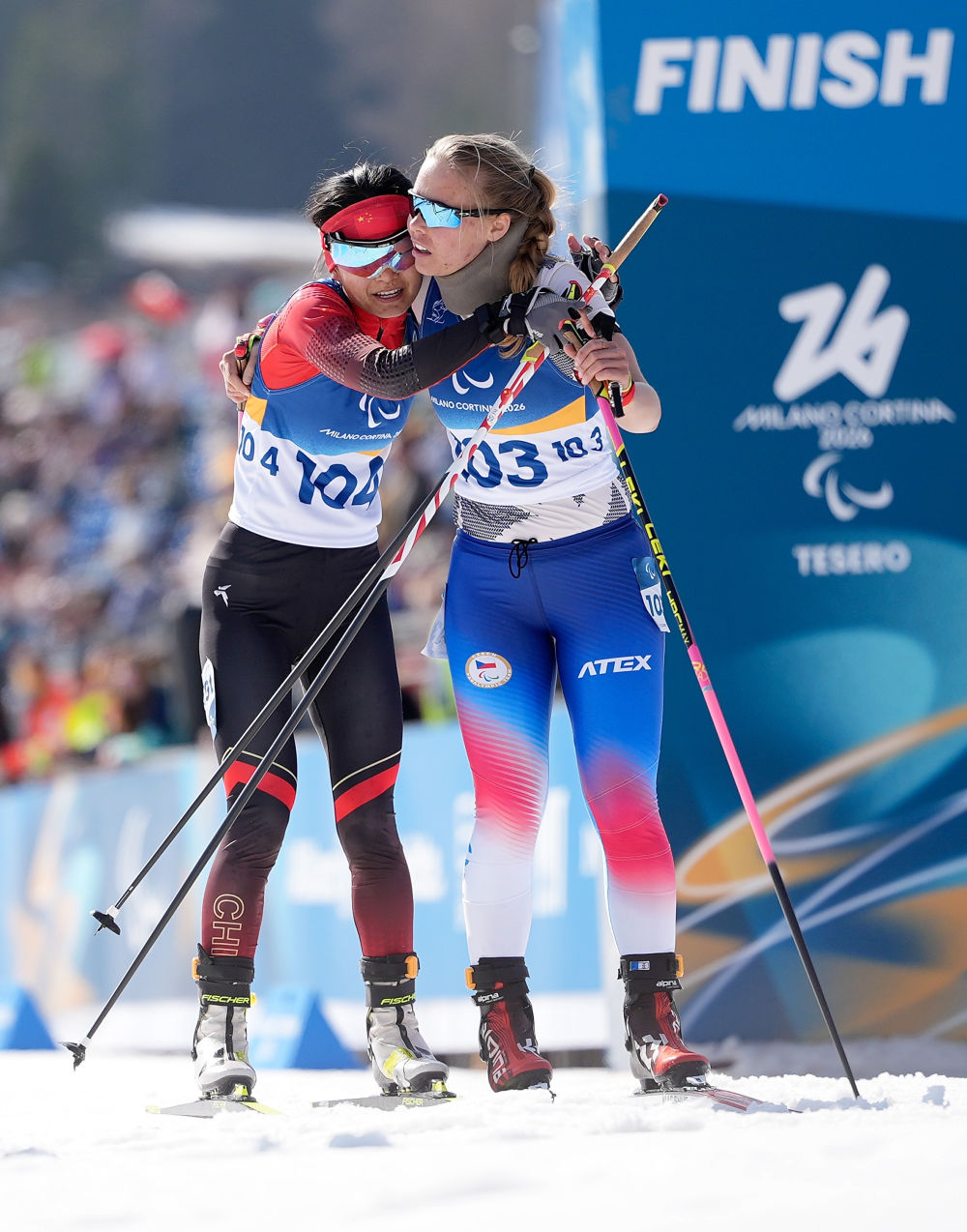 3月13日,中国选手王跃(左)在比赛后与捷克选手卡丽娜·埃德林格罗娃拥抱。当日,在意大利泰塞罗举行的米兰-科尔蒂纳冬残奥会冬季两项女子短距离追逐(视障)比赛中,中国选手王跃获得亚军。新华社记者 侯昭康摄
