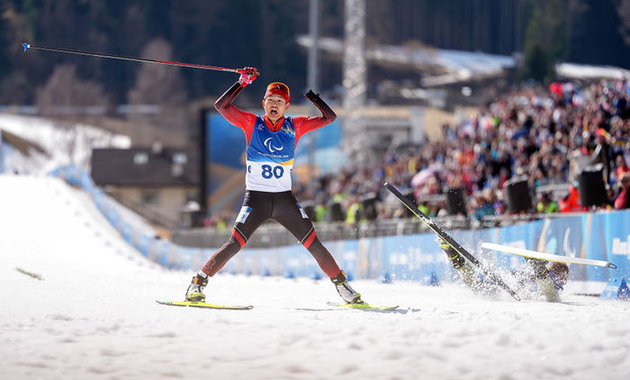 3月13日,中国选手余爽在夺冠后。当日,在意大利泰塞罗举行的米兰-科尔蒂纳冬残奥会冬季两项男子短距离追逐(视障)比赛中,中国选手余爽夺得冠军。新华社记者侯昭康 摄