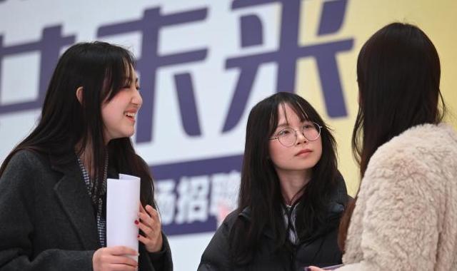 3月18日,江苏南京,大学生在招聘会上咨询洽谈。当日,“立‘邺’新时代 ‘媒’好共未来”南京市建邺区新媒体企业春季专场招聘会在龙湖南京河西天街举办。本次活动由南京市建邺区委统战部牵头多部门联合主办,充分发挥新的社会阶层人士优势,集结优质新媒体企业,打造高校青年与新媒体行业精准对接服务平台,为数字经济与新媒体产业的高质量发展注入青春动能。中新社记者泱波 摄