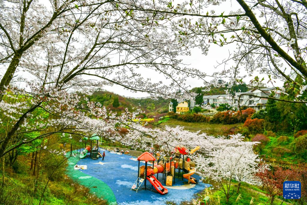 3月21日,游客在位于贵州省遵义市新蒲新区的樱花谷景区休闲游玩。新华社发(罗星汉摄)