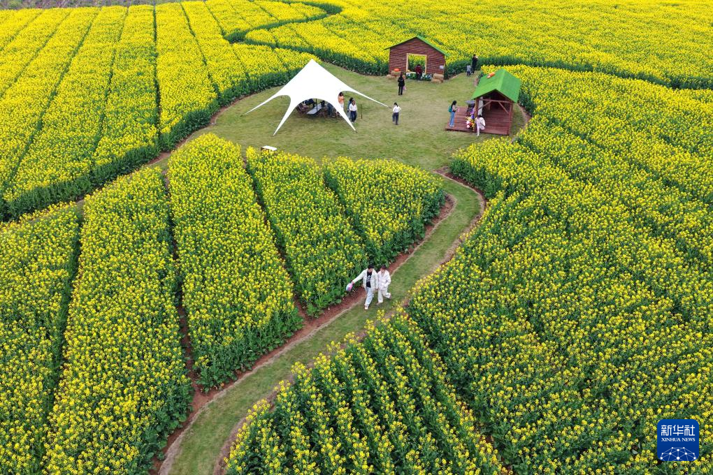 3月21日,游客在江苏南通洲际梦幻岛梯田花海游览(无人机照片)。新华社发(许丛军摄)