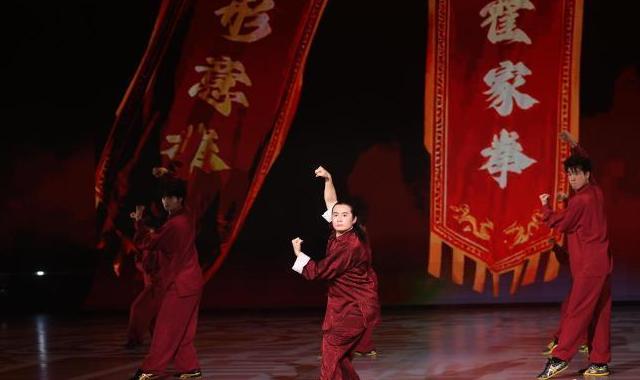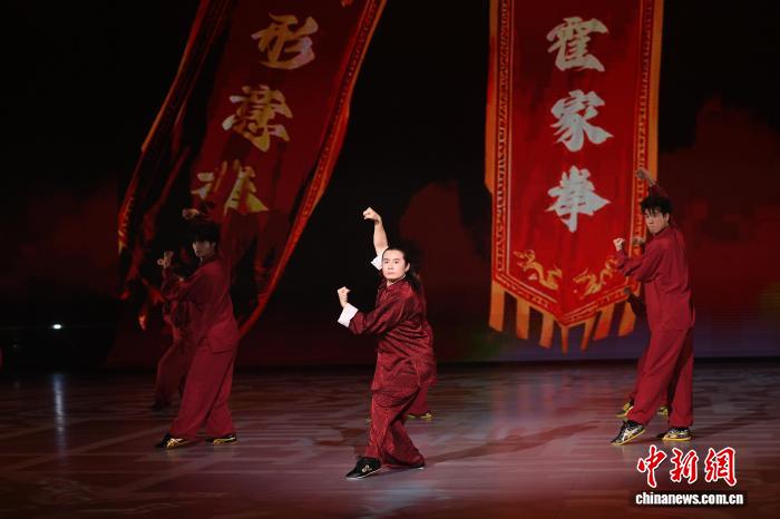 图为霍元甲玄孙女、霍氏练手拳第五代代表性传承人霍静虹(中)在开幕式上展演。中新社记者 佟郁 摄