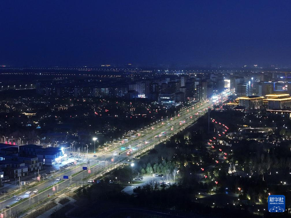 雄安新区商务服务中心片区夜景(3月16日摄,无人机照片)。