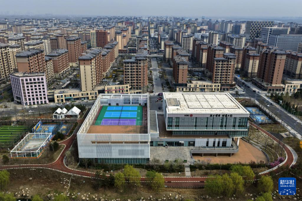 雄安新区图书馆(前)和奥体中心(3月18日摄,无人机照片)。