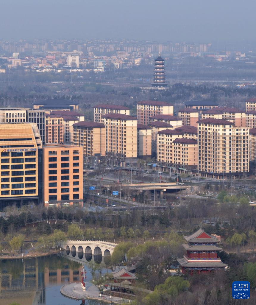 这是雄安新区悦容公园安和塔(3月18日摄,无人机照片)。