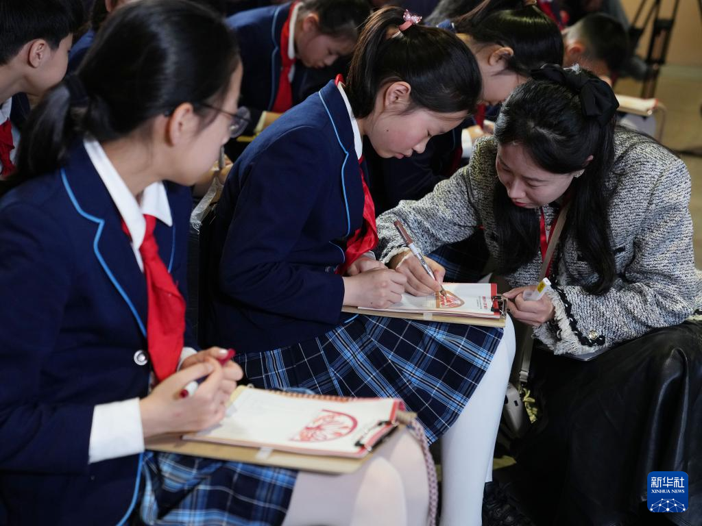 3月30日,在中共一大纪念馆展厅内的美术课堂上,老师指导学生们围绕石库门建筑特征进行创作。