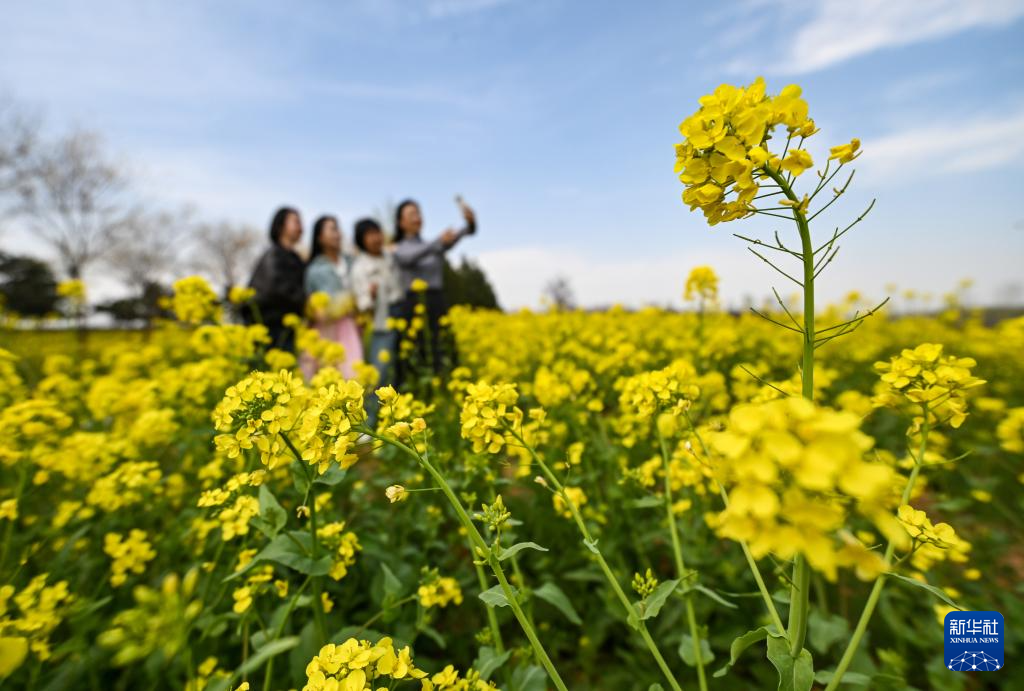 4月1日,人们在河北省石家庄市灵寿县牛城乡故城村的油菜花田里踏青赏花。