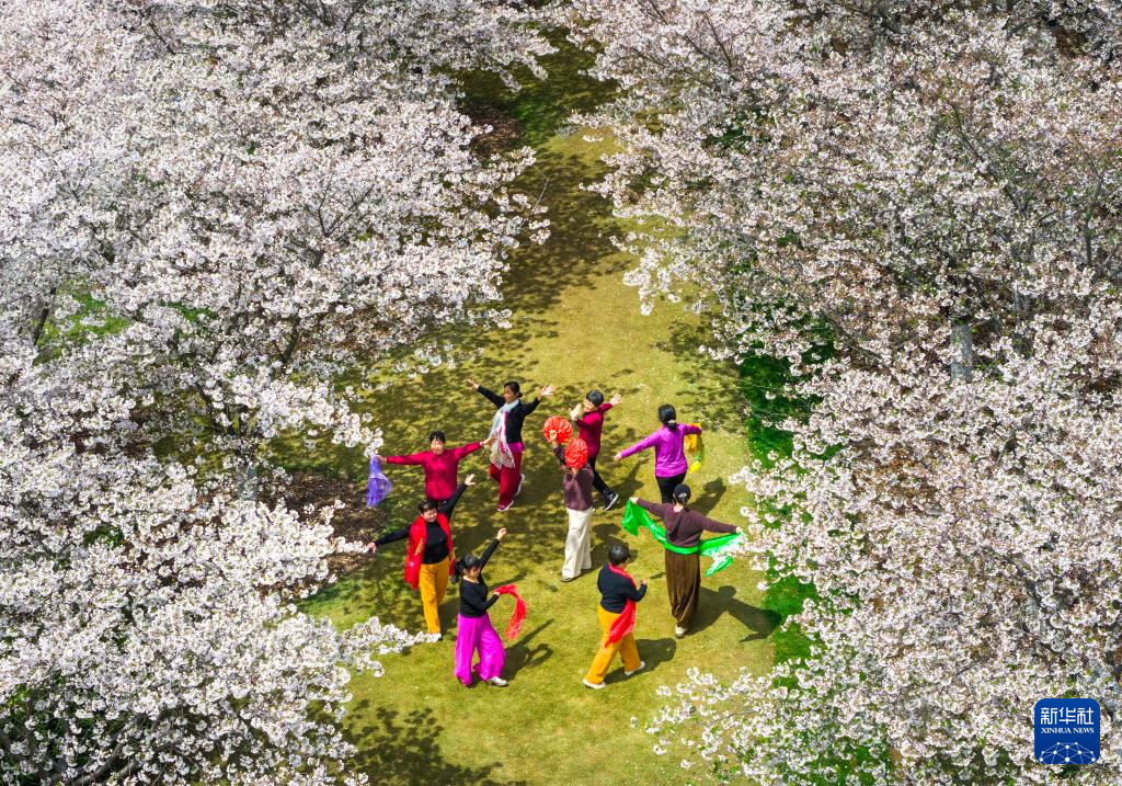 4月1日,游客在浙江省宁波植物园樱花树下休闲娱乐(无人机照片)。