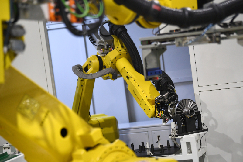 1月20日,在位于咸阳市秦都区装备制造产业园的法士特智能制动公司,缓速器机加车间转子下料单元的机械臂在生产线上工作。新华社记者李一博 摄