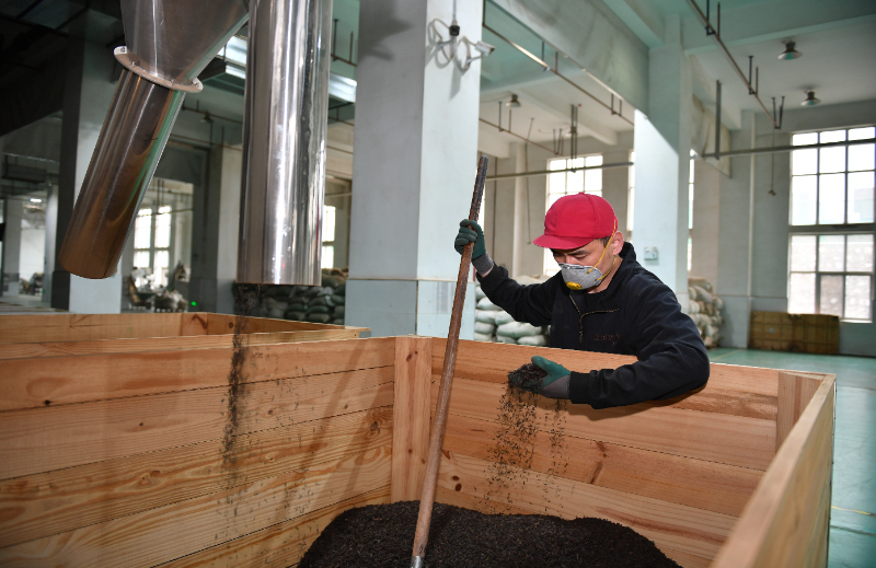 3月13日,工人在泾渭茯茶智能化车间查看茶叶筛选情况。新华社记者 李一博 摄