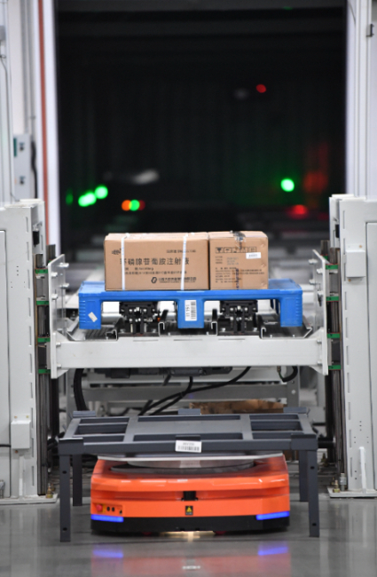 3月13日,智能搬运机器人在咸阳医药工业集团现代物流仓搬运药品。新华社记者 李一博 摄