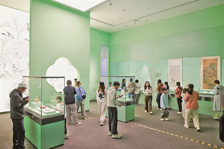 开展一个多月来,观众已超32万人次。据介绍,展厅中的几处打卡点备受观众青睐。其中一处以清代董诰的《平安春喜册图·之一》作为背景,采用四叶草透窗设计营造出古风氛围,随手就能拍出具有美感的汉服写真。另一处以清代青花三多纹梅瓶作为前景,插花为背景,营造出花入瓶中的视觉差,让观众轻松定格最美瞬间。记者看到,不少观众特意穿上汉服,在传统窗花前留下一张张和文物对话的精美照片。