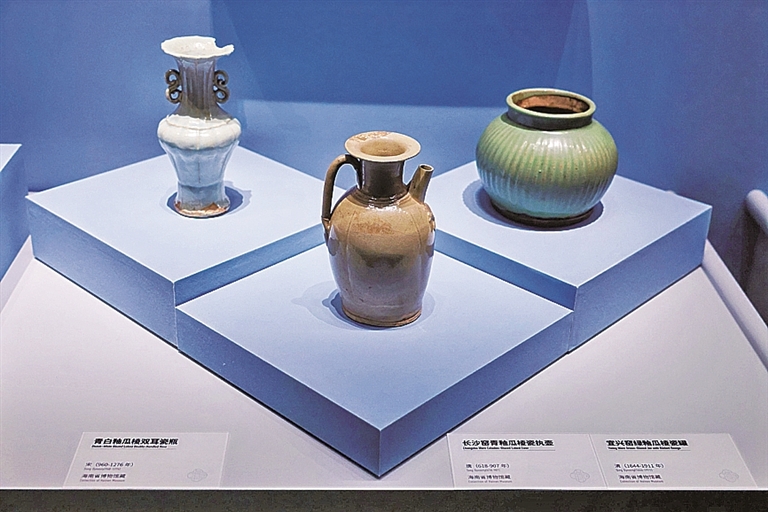 从左至右依次为青白釉瓜棱双耳瓷瓶、长沙窑青釉瓜棱瓷执壶、宜兴窑绿釉瓜棱瓷罐。图片由海南省博物馆提供