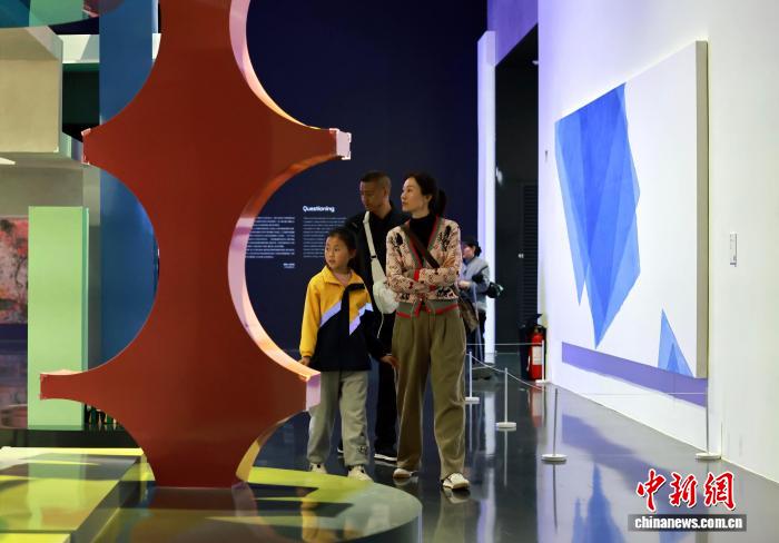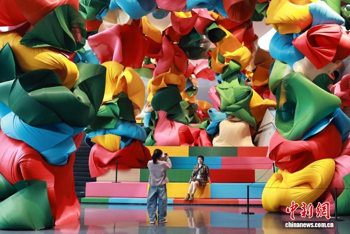 4月2日,成都市中小学春假第二天,不少家长带着孩子走进成都市美术馆观展研学,与孩子一起在艺术的殿堂里共享春假时光。图为在展出的装置作品前,一名小女孩给家长拍摄照片。中新社记者王磊 摄