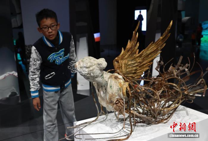 4月2日,成都市中小学春假第二天,不少家长带着孩子走进成都市美术馆观展研学,与孩子一起在艺术的殿堂里共享春假时光。图为一名男孩观看装置作品《伊卡洛斯》。中新社记者王磊 摄