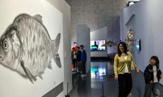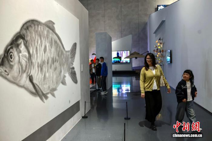 4月2日,成都市中小学春假第二天,不少家长带着学生走进成都市美术馆观展研学,与孩子一起在艺术的殿堂里共享春假时光。图为家长和孩子观看绘画作品《鲤》。中新社记者王磊 摄