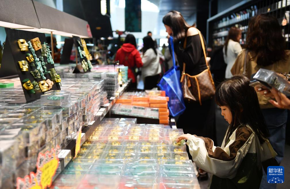 4月3日,小朋友在三星堆博物馆挑选文创纪念品。