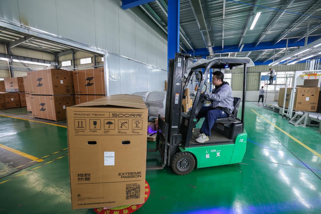 2026年4月1日,在重庆两江新区“张雪机车”生产车间,工作人员将包装好的整车搬运至库房等待发货。新华社记者 黄伟摄