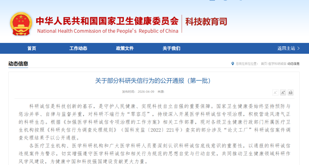 科研诚信是科技创新的基石,是守护人民健康、实现科技自立自强的重要保障。国家卫生健康委始终坚持预防与惩治并举、自律与监督并重,对科研不端行为“零容忍”,持续深入开展医学科研诚信专项治理,积极营造风清气正的科研生态。根据《加强医学科研诚信专项治理的工作方案》相关工作部署,现对各级卫生健康行政部门所属医疗卫生机构按照《科研失信行为调查处理规则》(国科发监〔2022〕221号)查实的部分涉及“论文工厂”科研诚信案件调查处理结果予以公开通报。