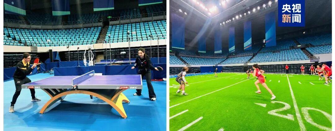 △中美“乒乓外交”55周年纪念大会现场,中美乒乓球与橄榄球跨项目互动体验。