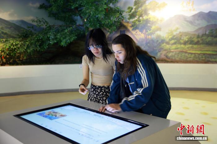 4月12日,浙江省欧美同学会组织浙江大学中国学留学生走进浙江丽水青田方山乡,实地探访首批全球重要农业文化遗产——青田稻鱼共生系统,近距离感受千年农耕智慧的活态传承与保护实践。图为留学生在稻鱼共生系统博物馆多媒体互动屏前了解稻鱼共生历史。中新社记者孙杨洋 摄