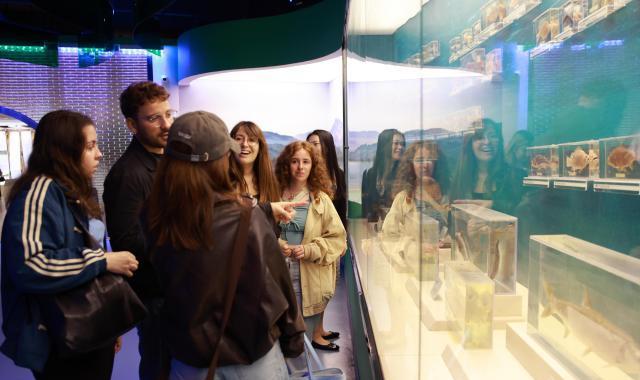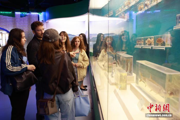 4月12日,浙江省欧美同学会组织浙江大学中国学留学生走进浙江丽水青田方山乡,实地探访首批全球重要农业文化遗产——青田稻鱼共生系统,近距离感受千年农耕智慧的活态传承与保护实践。图为留学生在稻鱼共生系统博物馆驻足观看瓯江水生生物标本。中新社记者孙杨洋 摄
