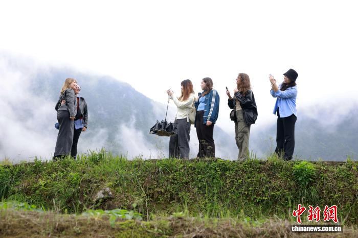 4月12日,浙江省欧美同学会组织浙江大学中国学留学生走进浙江丽水青田方山乡,实地探访首批全球重要农业文化遗产——青田稻鱼共生系统,近距离感受千年农耕智慧的活态传承与保护实践。图为留学生在稻鱼共生核心保护区拍照留念。中新社记者孙杨洋 摄