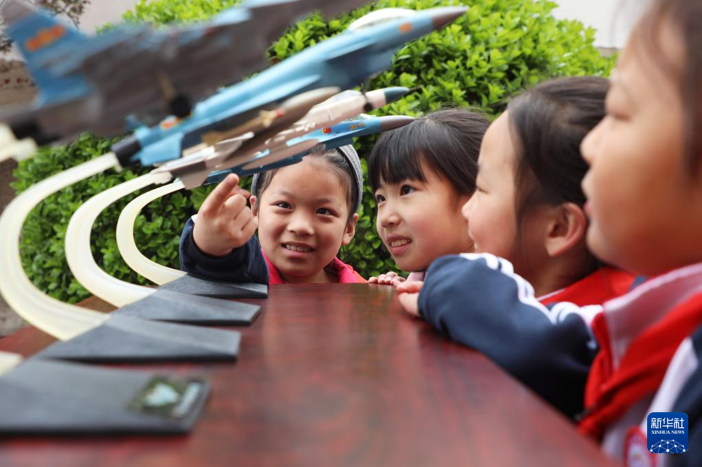 4月13日,在河北省唐山市丰润区火石营镇黄昏峪小学,学生通过模型了解国防武器知识。新华社发(朱大勇摄)