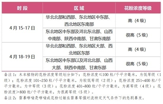 4月15日—17日,华北北部和西部、东北地区中东部、西北地区东南部等地的花粉浓度处于高等级(4级),部分地区花粉浓度处于很高等级(5级);18-19日,华北北部和西部、东北地区大部、西北地区东部等地的花粉浓度处于高等级(4级),部分地区花粉浓度处于很高等级(5级)。