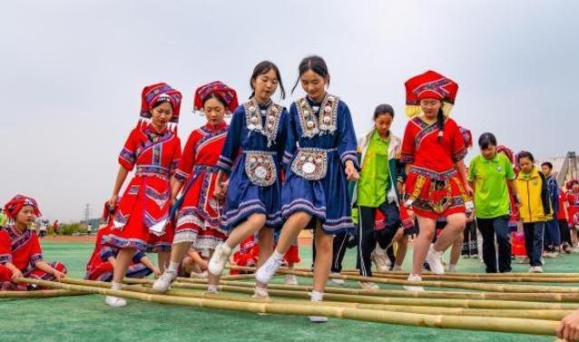 图为学生们在跳竹竿舞和抛绣球。高如金 摄