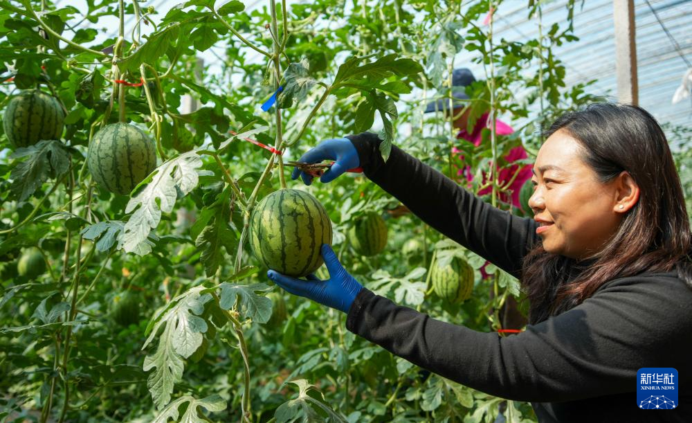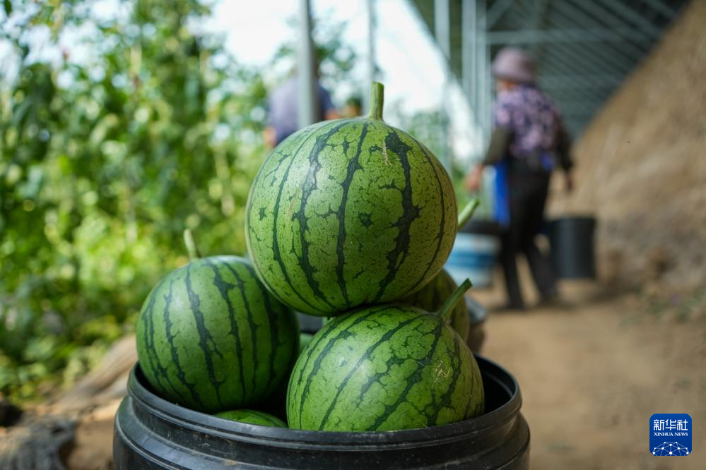 4月17日,在潍坊市昌乐县五图街道,瓜农在收获成熟的小型西瓜。