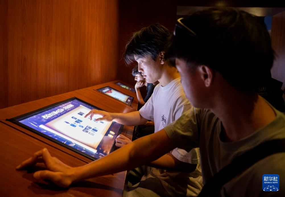 4月17日,美国青年乒乓球队队员在宁夏银川西夏陵博物馆内体验互动游戏。