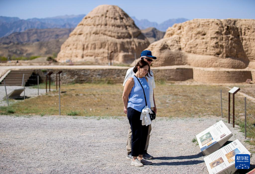 4月17日,中美“乒乓外交”亲历者朱迪·霍夫罗斯特(前)在宁夏银川市西夏陵景区参观。