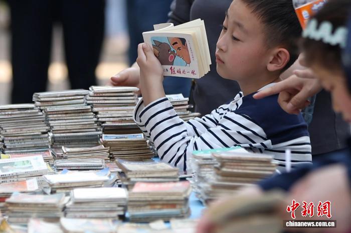 4月19日,江苏南京,小朋友在金陵旧书市集上阅览小人书。日前,以“旧书新知书香南京”为主题的金陵旧书市集在城南古巷熙南里街区开启,覆盖古旧书市、古籍科普、以旧换新、非遗工坊等七大类别,一站式满足民众淘书、研学、互动、消费等多种需求。中新社记者泱波 摄
