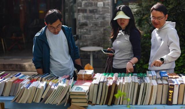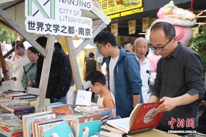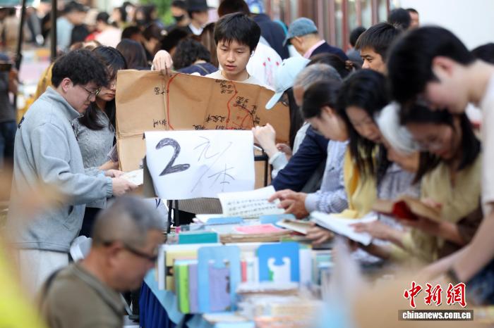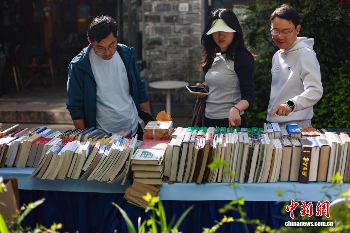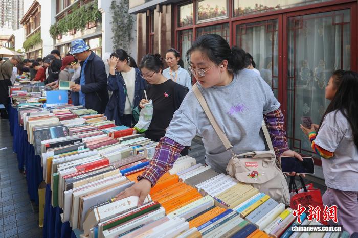 4月19日,江苏南京,市民在金陵旧书市集上淘书。日前,以“旧书新知书香南京”为主题的金陵旧书市集在城南古巷熙南里街区开启,覆盖古旧书市、古籍科普、以旧换新、非遗工坊等七大类别,一站式满足民众淘书、研学、互动、消费等多种需求。中新社记者泱波 摄