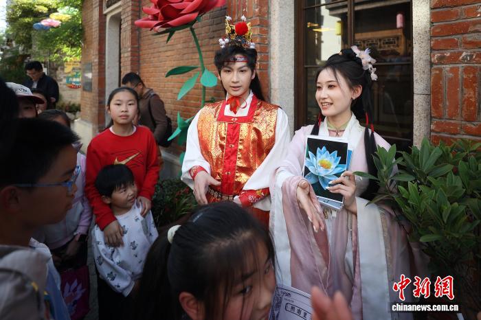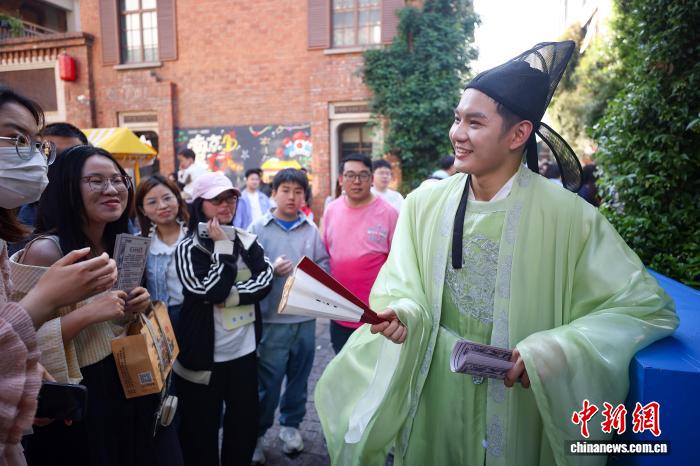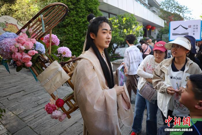 4月19日,江苏南京,古装打扮的年轻人在金陵旧书市集上与市民互动。日前,以“旧书新知书香南京”为主题的金陵旧书市集在城南古巷熙南里街区开启,覆盖古旧书市、古籍科普、以旧换新、非遗工坊等七大类别,一站式满足民众淘书、研学、互动、消费等多种需求。中新社记者泱波 摄