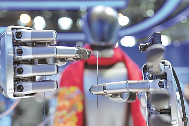 在北京中关村展示中心常设展上,一台配备了灵巧手的机器人在展示穿针引线。新华社发