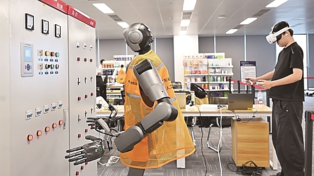 广东广州市海珠区,工作人员在模拟环境下训练机器人进行电力设备巡检与维护。新华社发