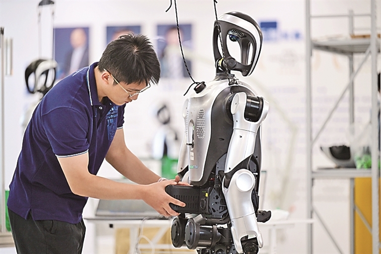 安徽合肥,工程师在给机器人安装电池。新华社发