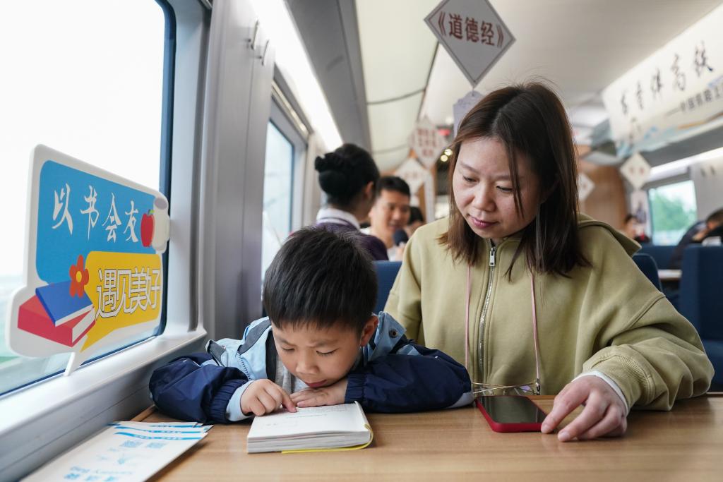 4月20日,一名小旅客在G7378次列车上举行的“书香伴高铁 阅读润旅途”列车阅读会上阅读。