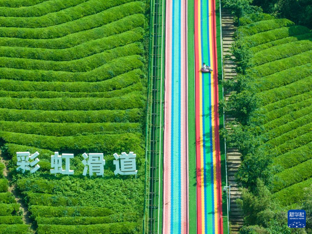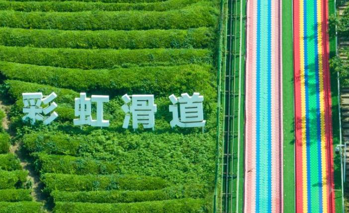4月26日,游客在杭州市余杭区径山镇小古城村体验“彩虹滑道”(无人机照片)。