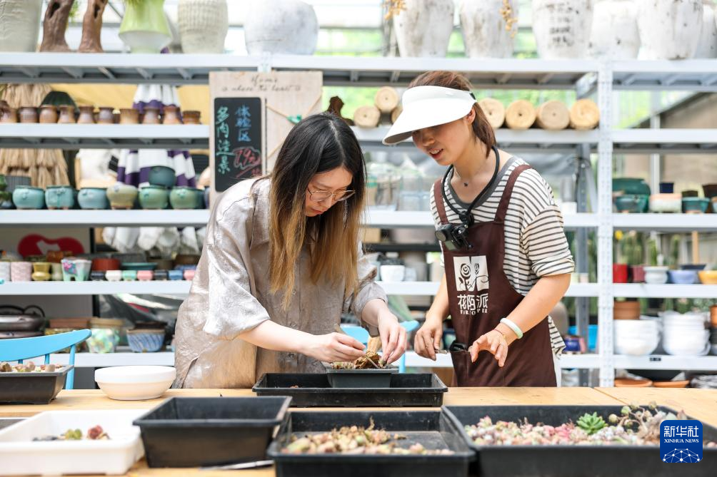 4月25日,在杭州市上城区丁兰街道沿山村的一家多肉种植基地内,工作人员(右)指导游客进行多肉植物造景。