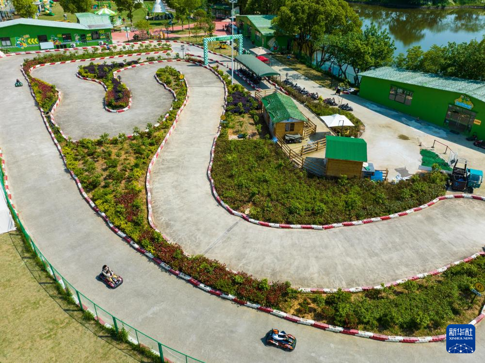 4月26日,游客在杭州市余杭区径山镇小古城村驾驶卡丁车(无人机照片)。