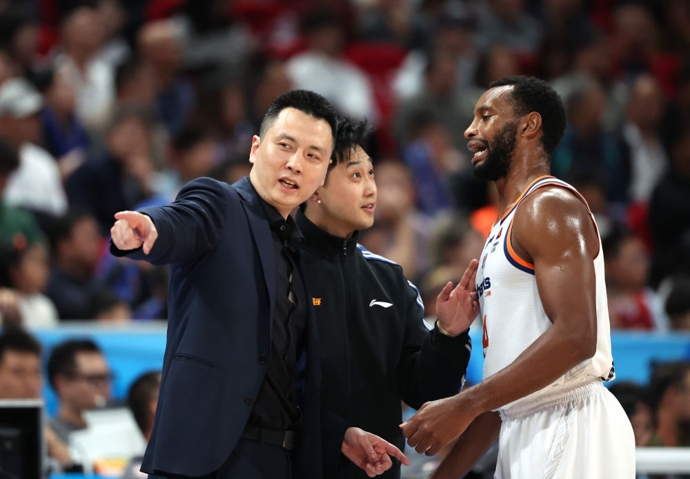 4月12日,上海队主教练卢伟(左)在比赛中指导球员弗格(右)。新华社记者 张晨 摄