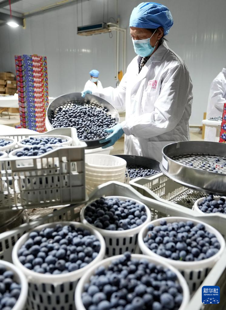 4月27日,河北省卢龙县胜行家庭农场的工人在分拣蓝莓。