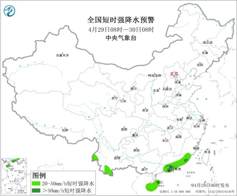图1 全国短时强降水预警(4月29日08时-30日08时)