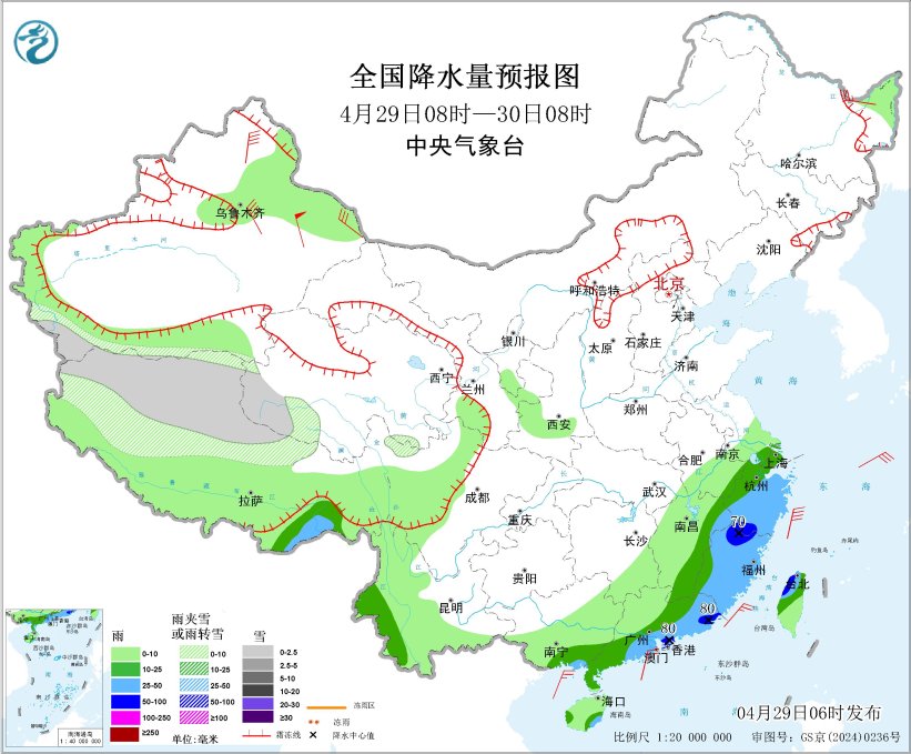 4月29日08时至30日08时,西藏北部和西部、青海南部等地部分地区有小雪或雨夹雪。西藏东南部、江南东部、云南西南部、华南东部和南部等地部分地区有中到大雨,其中,浙江南部、福建北部、广东东南部、台湾岛北部等地部分地区有暴雨(50~80毫米)。新疆沿天山地区和东部等地部分地区有5~6级风,其中,新疆东部部分地区有7~8级风(见图4)。