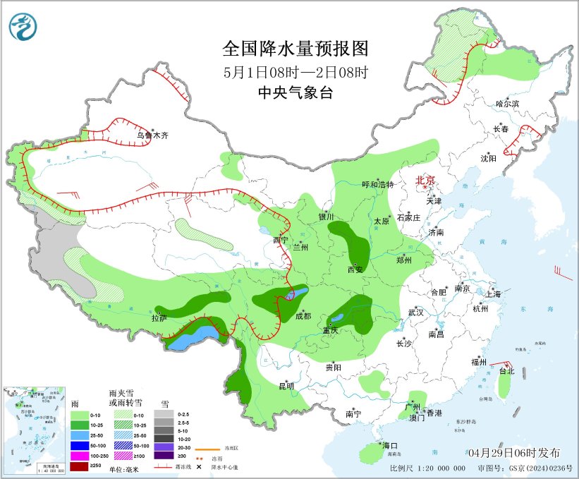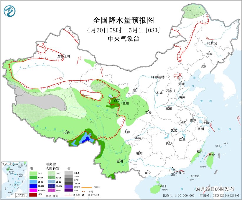 图4 全国降水量预报图(4月29日08时-30日08时)