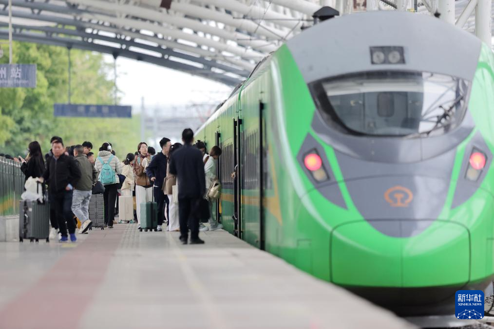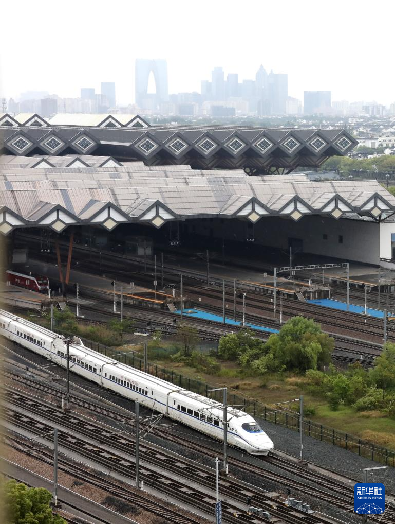 4月29日,一列动车组列车从江苏苏州站驶出。